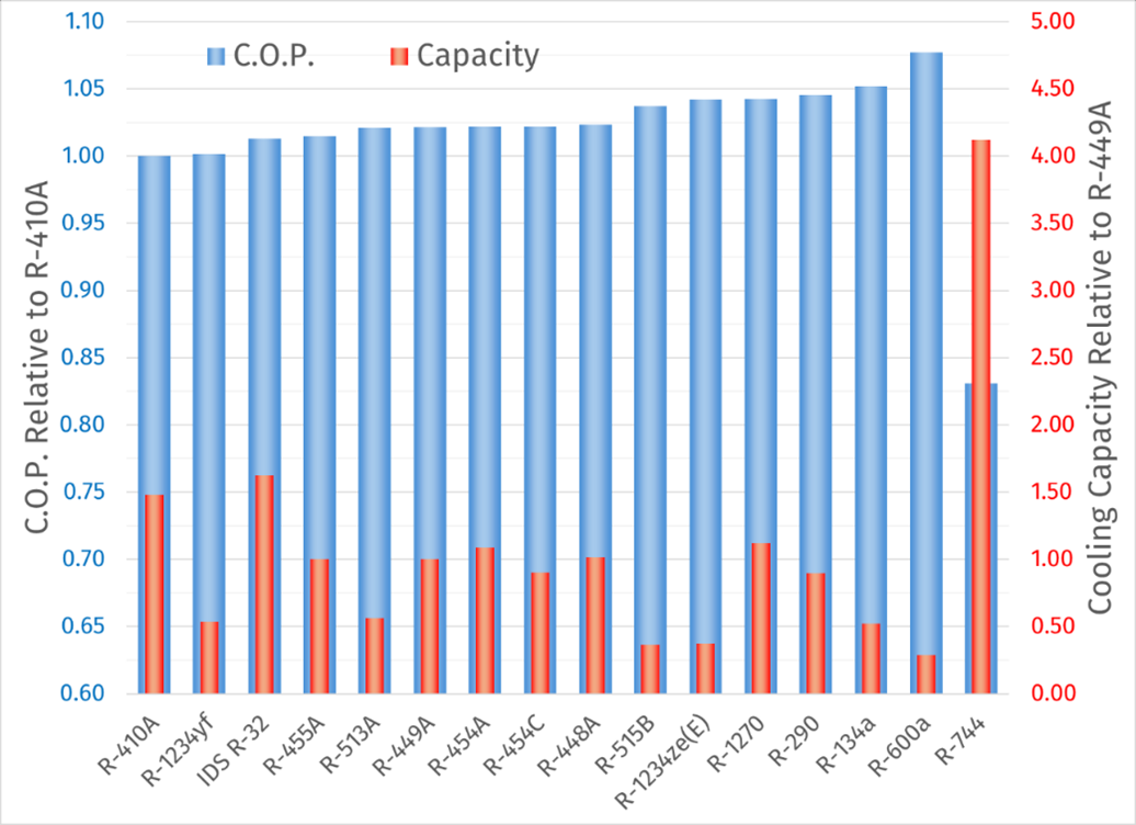 With this in mind, how many of us can honestly say when specifying a project that the most important factor considered is the energy efficiency? There are of course many different factors that define the energy efficiency of a system, but when it comes to refrigerant choice each refrigerant has a fundamental thermodynamic energy efficiency at a given set of conditions, an example is given in figure 2.