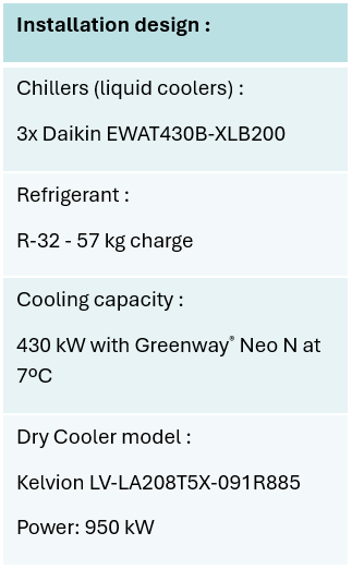 To replace the old units, dry coolers from Kelvion were selected to meet both operational requirements and the customer's sustainability goals. Three Daikin liquid chillers were also installed and charged with 57 kg of R-32.